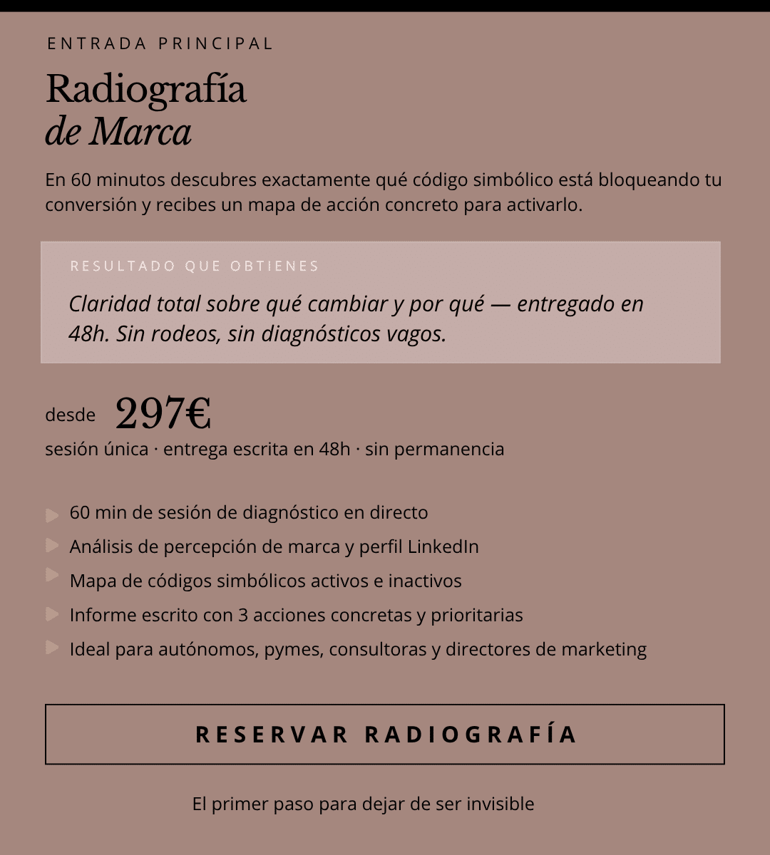 Analizamos qué arquetipos de marca y códigos simbólicos está enviando tu comunicación ahora mismo — cuáles generan confianza instintiva y cuáles están bloqueando la decisión de compra inconsciente de tu cliente ideal.
