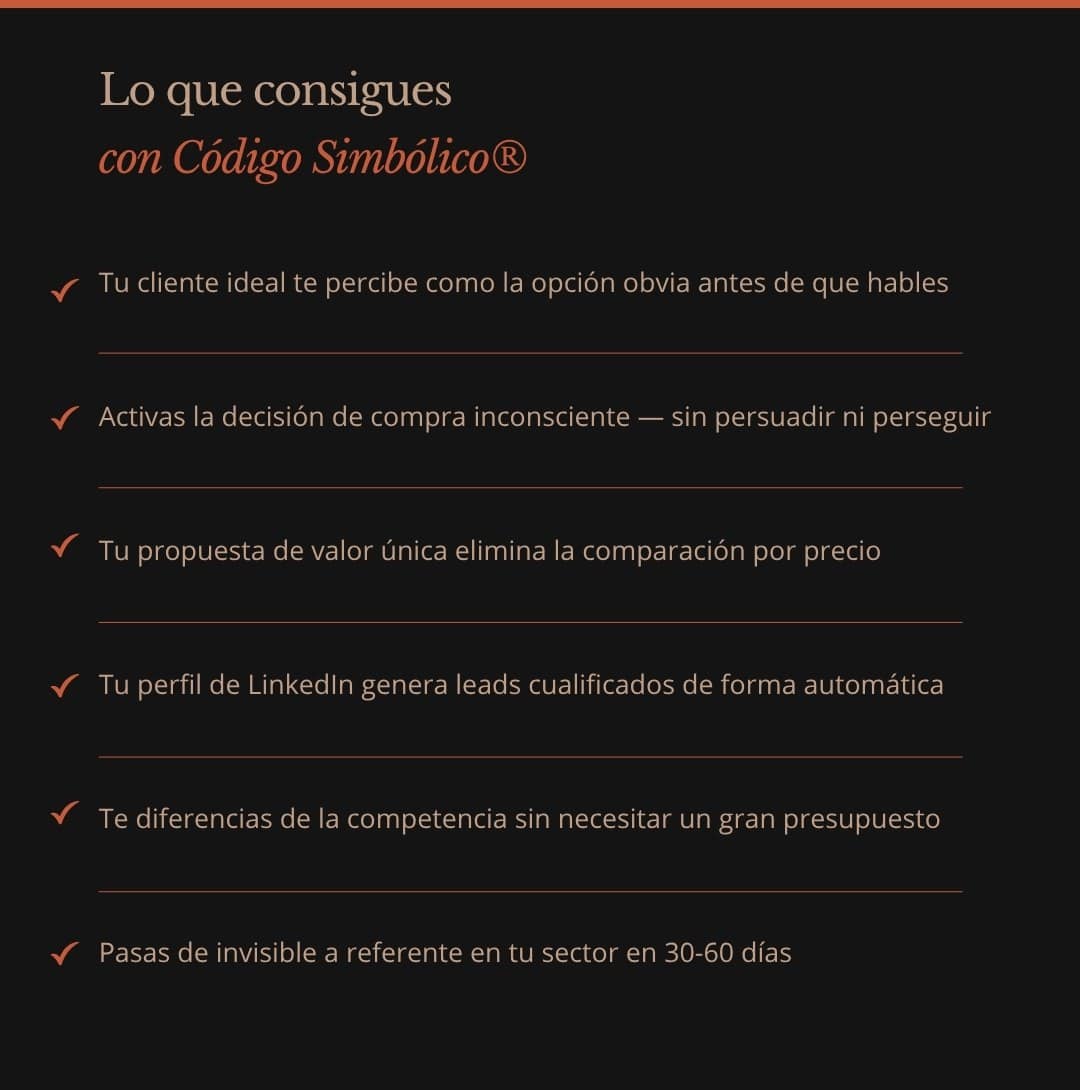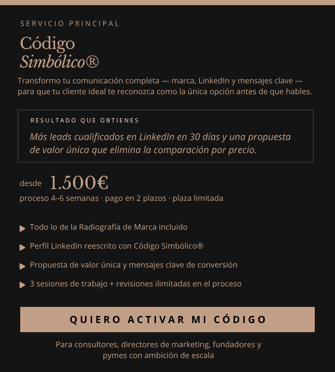 Aplicamos el Código Simbólico® en tu perfil LinkedIn, mensajes clave y comunicación de marca. Resultado: captación orgánica de clientes ideales sin publicidad de pago ni técnicas de persuasión.