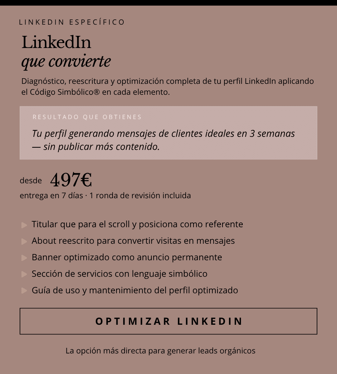 Transformo tu perfil de LinkedIn en una herramienta activa de captación de clientes ideales. Si tienes visitas pero no generas leads, lo diagnostico, reescribo y optimizo con Código Simbólico®.